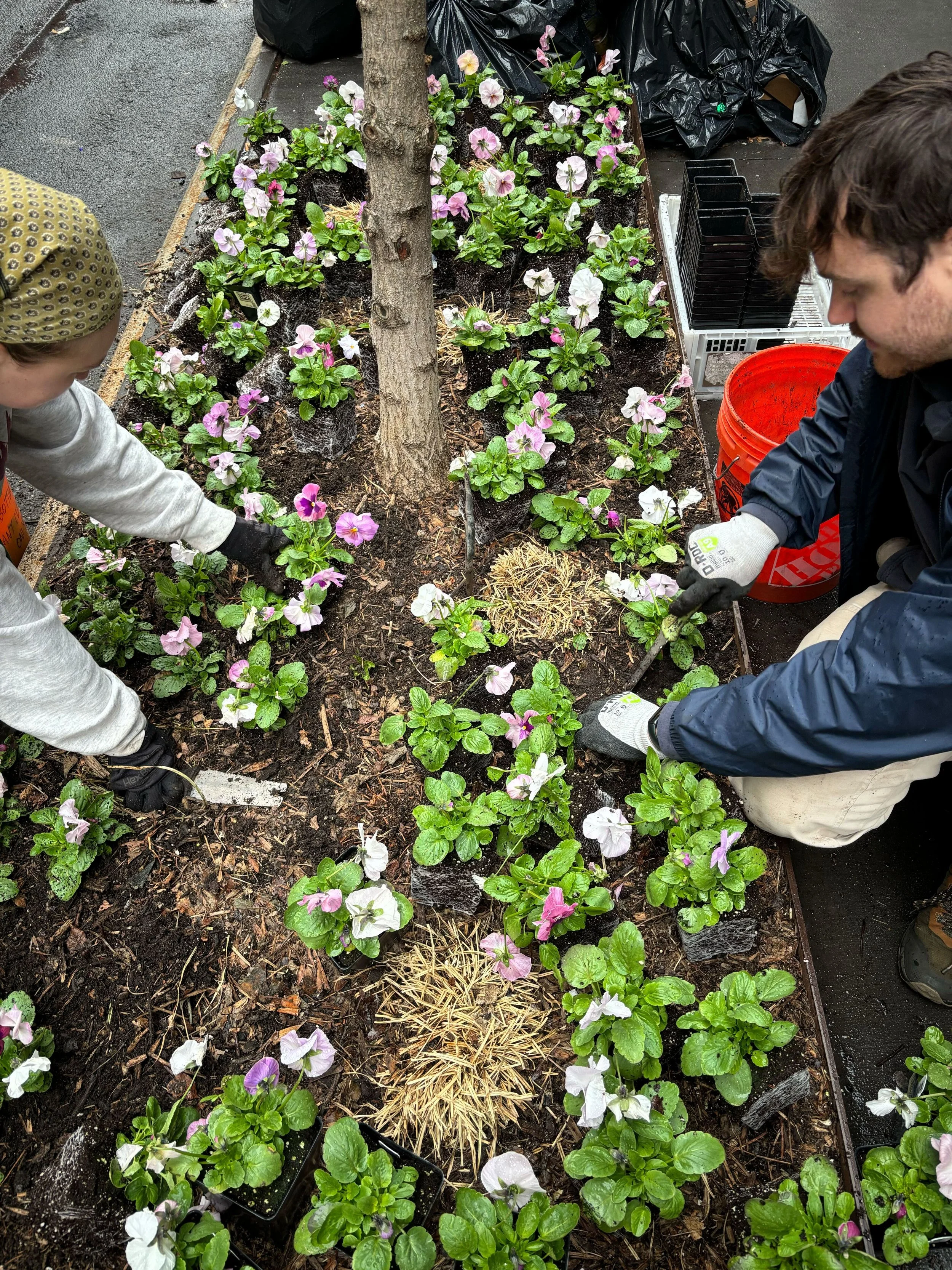 After a full seven-story interior redesign of this Nolita office, Brooklyn Grange was engaged to landscape from the street to the upper terrace, including a refresh of the backyard landscape, interior greenery on every floor with potted tropicals, a new potted garden on the upper terrace, and a seasonal rotation of annuals in the sidewalk tree bed. The backyard plant palette drew inspiration from the existing Japanese Maple and original Japanese wall tiles, with additions like Iris ensata and Hakonechloa macra. In spring, delicate but hardy pansies are planted in the tree bed followed by a beautiful mix of summer annuals, including begonias, dahlias, and caladiums.