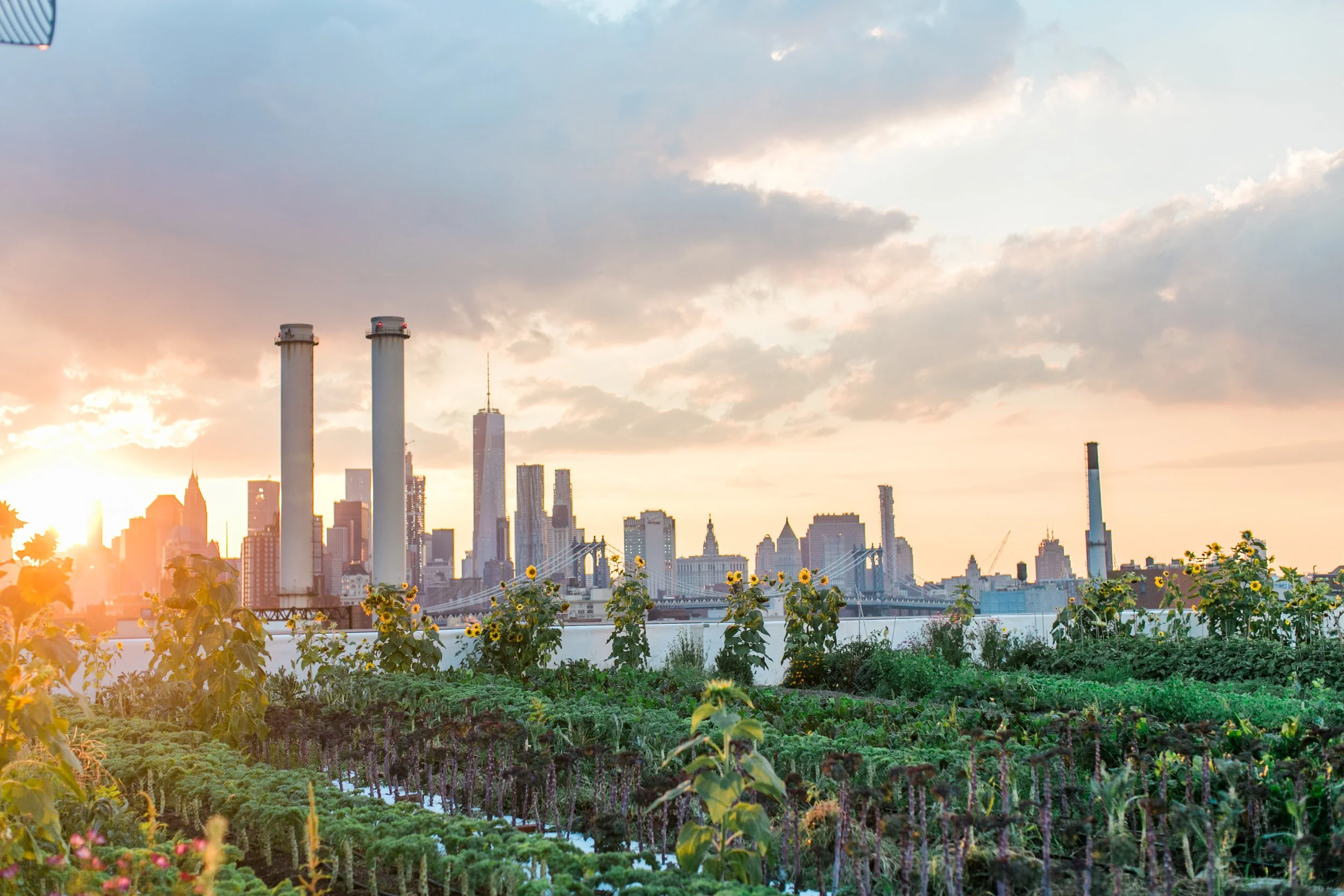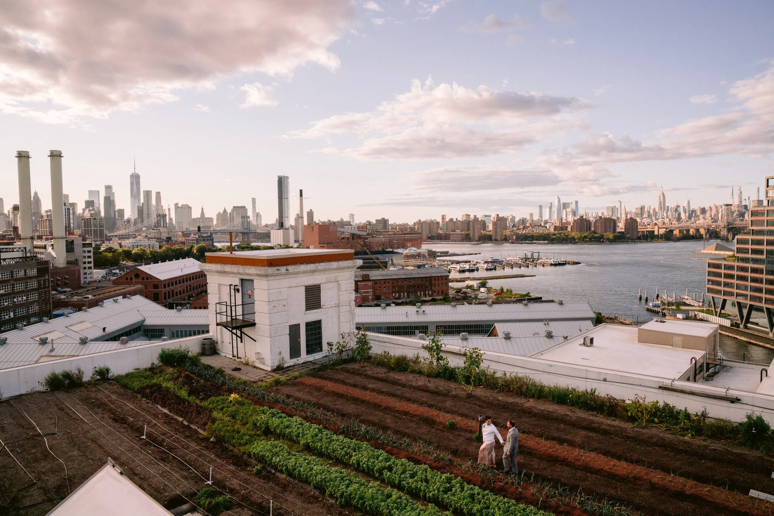 Our Brooklyn Navy Yard farm is a unique venue for your rooftop wedding that will leave you and your loved ones breathless. With golden sunset rays streaming across the river and the twinkling lights of the Manhattan skyline like so many candles lit just for you, there is no more romantic setting to tie the knot than our secret garden.