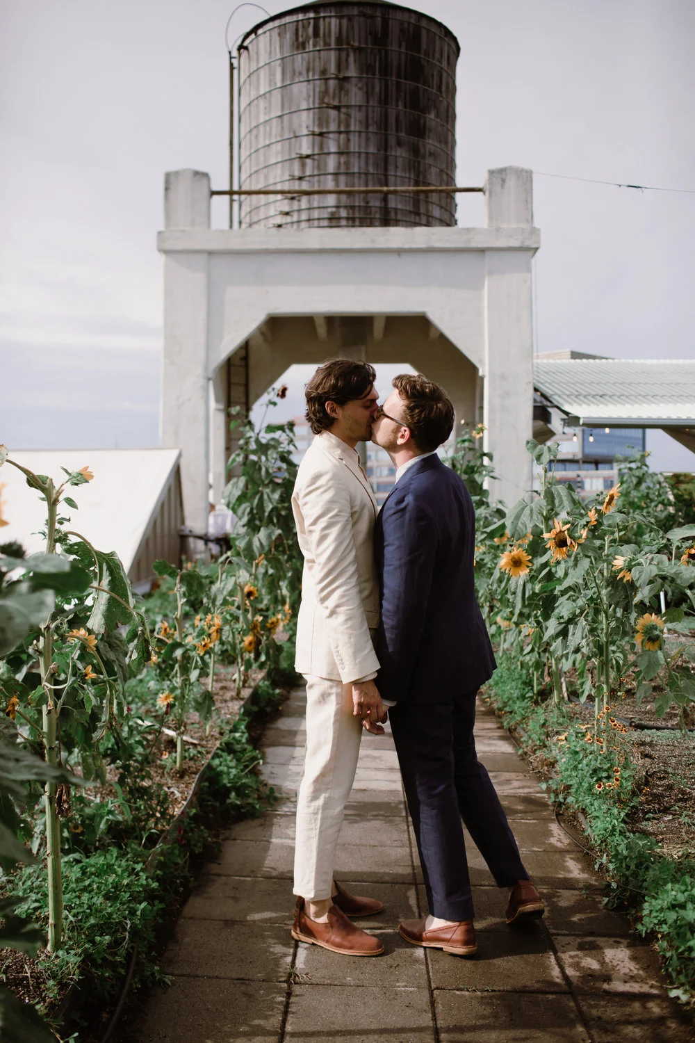 Combining the rustic seasonality of a working farm with an unbeatable rooftop location, our 1.5-acre Brooklyn Navy Yard farm is the perfect setting for a wedding. Guests are greeted by panoramic views of the Manhattan skyline and East River waterfront as they follow winding paths between fields of seasonal crops to the main event. A large, paved, deck in the center of our rooftop farm is perfect for a welcoming bar setup, cocktail-style mingling, and seated dining. This patio is covered by a weatherproof awning for rain protection and strung with elegant, dimmable Edison bulb string lights.